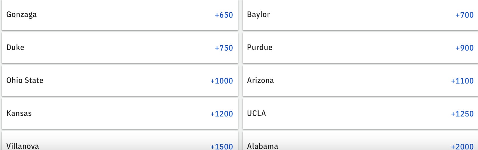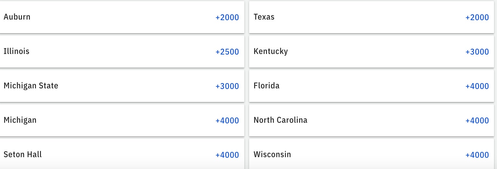 I have since added Arizona at 35/1 a few weeks back and doubled down when Kentucky dropped to 30/1. If you want to put a bet in now, here's what I'd look at: