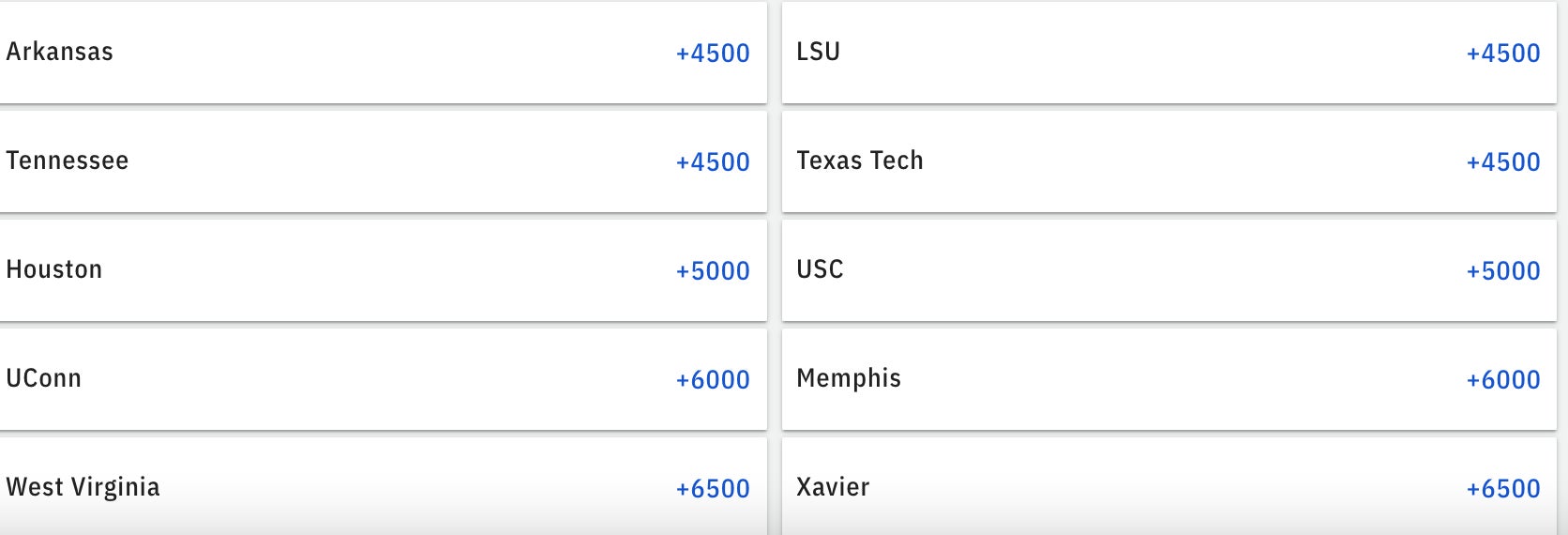I'm not adding anything to mine, again, this is if you want a future bet in January to place. I'd immediately go look at Kansas 12/1, Auburn 20/1 and LSU 45/1. LSU is the best defense in the country, which is worth noting. They are good enough there to advance and possibly get to a Final Four. They just need some offense. Kansas is figuring everything out after benching David McCormack and the improvement of someone like Christian Braun. Then there's Auburn who has Jabari Smith and just plays the unique style. Take a shot on those three.