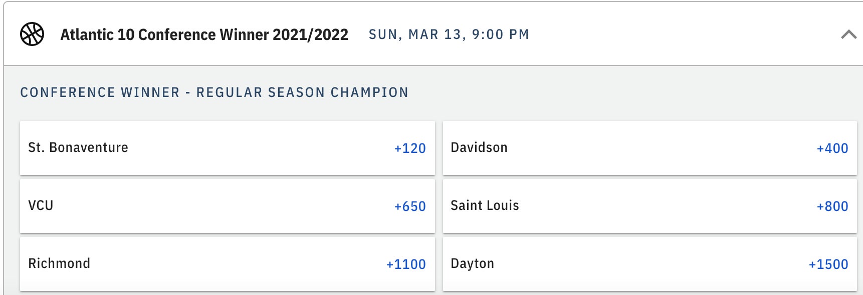 The A-10 is a complete crapshoot with St. Bonaventure not really living up to the hype and Kyle Lofton missing some games. I'd take a shot at Davidson +400 here. They might be the best team in the conference. They only play the Bonnies once and even though it's on the road they won't be +400 in that game. Think it ultimately comes down to those two teams. They've won 10 straight games. They have Bob McKillop and that beautiful offense.