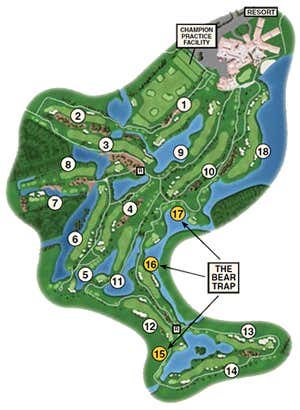 I suppose I could have picked any one of these holes (or even all of them), but I'll just take the first hole of the Bear Trap. Statistics may show that the 17th is a smidge more challenging than the 15th, but it's the notion of "The Bear Trap" that sticks with me here. It's everlooming presence during the course of a round is just so ominous. It'll fuck your day up.