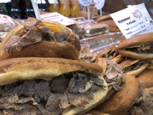 Lapin Poron Kylmäsavuliha - this is cold-smoked reindeer meat which is best in kebab style. This strong tasty meat is on a hoagie roll and is perfect for a filler when you are out on the town or after a nice win.