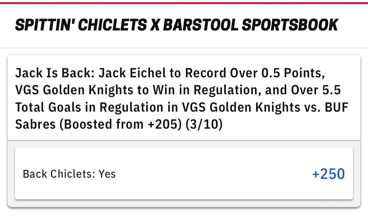 Vegas has not won every game by 4-5 goals like many thought when they added him, but he will eventually get back in game shape and mesh with his new teammates. A return to Buffalo against his old friends and teammates might just be the game that he needs to break out offensively with a huge game and a huge win, so the chiclets crew put together a boost to make the game even more interesting.