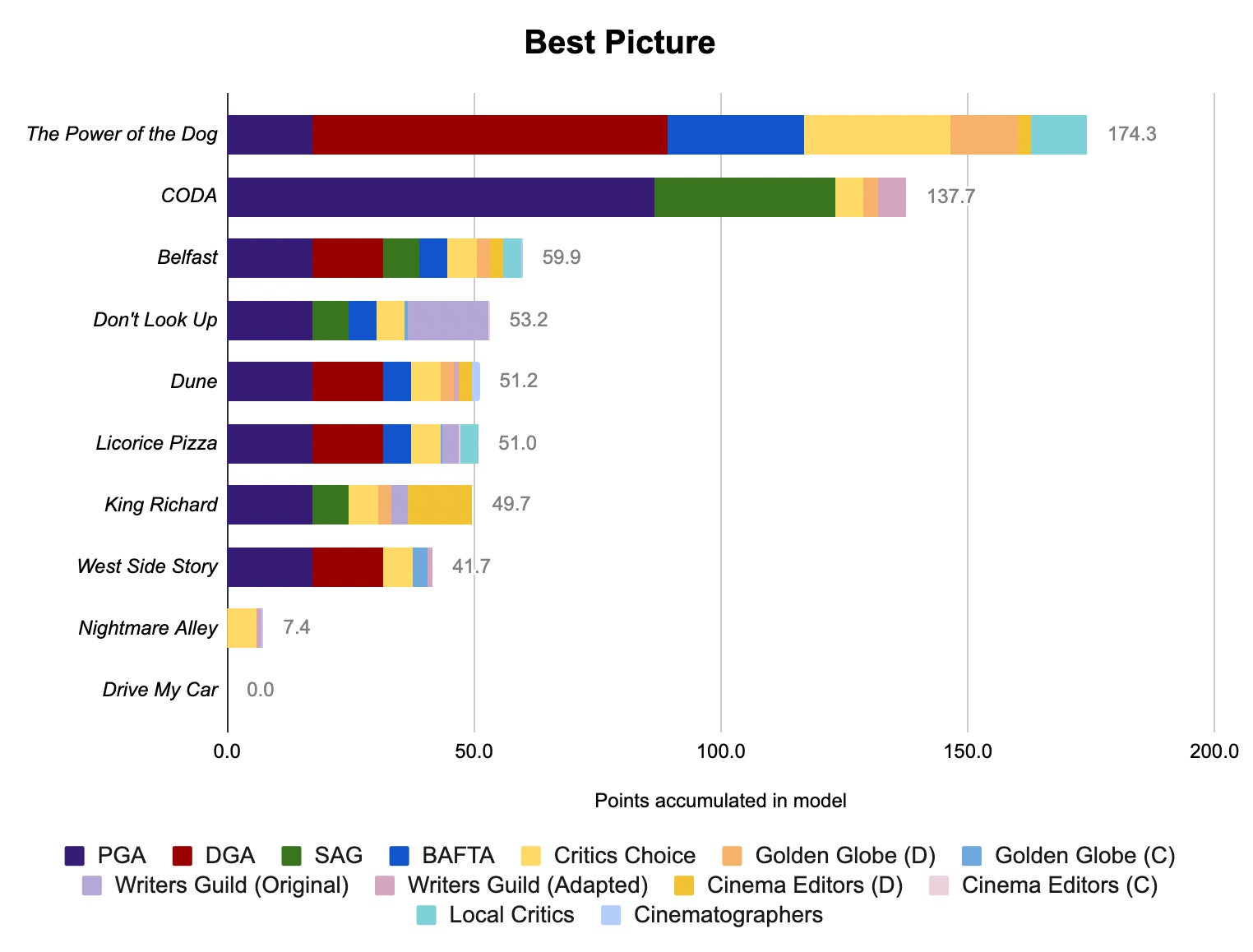 WALT: 100%, it's a two horse race. The Producer's Guild is the only precursor that we still have a great deal of confidence in over the past couple of years, and CODA just won there. They vote the same way as the Academy does through ranked choice, lots of the branches that have expanded in the past couple of years in the Academy are the same branches that would be represented in an organization like the PGA, and they tend to have most of the Oscar field as nominees. That said, Power of the Dog has had a stellar season, with wins at DGA, Critics Choice, Golden Globe, and BAFTA. It's a tight race and it's a toss up, super exciting year.