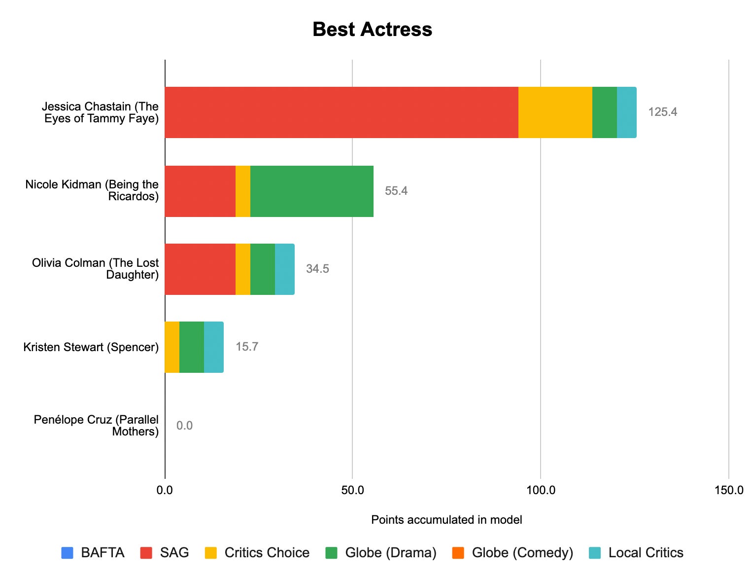 WALT: I love Best Actress this year. I have to give Jessica Chastain the edge, absent a BAFTA race the SAG is always going to be queenmaker. Chastain's got a great case: she produced this movie, she fought for this part, she's got a track record that people like, two previous Oscar nominations, she's really outstanding in this role, and Oscar's a sucker for actors portraying real people. That said, Olivia Colman's pulled off an upset before, and Nicole Kidman's got a constituency here. The Spencer stans can't get enough of Kristen Stewart, but I personally don't see it. It's going to be a hell of a race, as it should be.