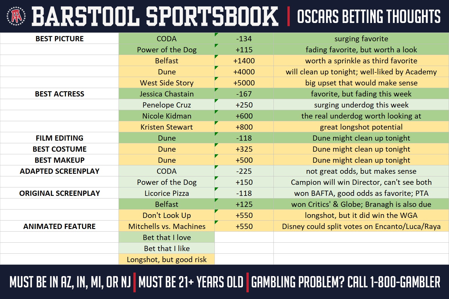 While those two movies are the clear favorites, I do think there are two others to look at if you're trying to grab a huge upset. Because you can look at this category as a "Least Disliked" award, the movie BELFAST (+1700) is worth taking a look at. Kenneth Branagh has never won at the Oscars, and the director-writer-producer of the much-beloved movie has a good chance to finally get some recognition this year. In terms of super-longshots, WEST SIDE STORY (+5000) and DUNE (+4000) would have pretty easily-explained reasons for pulling off a huge upset. With the re-make of West Side Story, you have a Steven Spielberg project, and one that is a re-make of a movie that also won BEST PICTURE back at the 1962 Oscars. As for Dune, the sequel(s) will likely get the stronger BEST PICTURE push, but the movie has a shit load of nominations, is clearly loved by the Academy, and might clean up tonight in all of the technical categories.