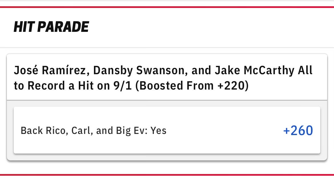 Today's lineup is : Jake McCarthy of The Arizona Diamondbacks , Jose Ramirez of The Guardians, and Dansby Swanson of The Braves. It's juice to +260 , come ride the boys on our quest to 25 units !