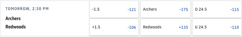 The Redwoods have been up and down this year. The start of their season was brutal and it looked like they were going to be in for a looooong summer of getting shelled. But ever since week 4 they've been playing some great ball. A 1-goal loss to the Whipsnakes, a 1-goal loss to the Archers, a 1-goal win over Atlas, a close loss to Chaos, a good win over Cannons, a 2-goal win over Waterdogs, and finally a 1-goal loss to Chrome. So they're right there in every game, they just don't get a ton of wins. Unfortunately, that's exactly how I see this game playing out. Redwoods will be able to win a bunch of faceoffs and get their offense enough touches to keep up with the Archers on the scoreboard. But they won't have Eddy Glazener on defense and that might be just enough of a crack in their shield to let Archers come out on top. So Redwoods +1.5 is the play, but Archers should be moving on.