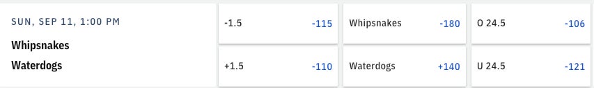 Let's thread the needle here. Waterdogs +1.5, Whipsnakes ML.