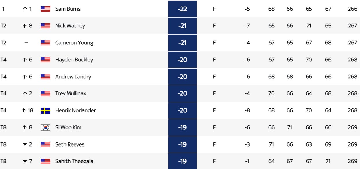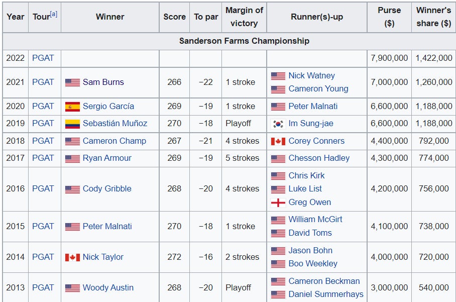 Last year it was Sam Burns who edged out Nick Watney and then relative unknown Cameron Young for a 1-shot victory. Burns went on a torrid stretch to start the back 9 Sunday with birdies on 4 out of 6 holes, which gave him a comfortable enough cushion to afford to bogey the final hole. It was his first win in a season where he would go on to win 3 total.