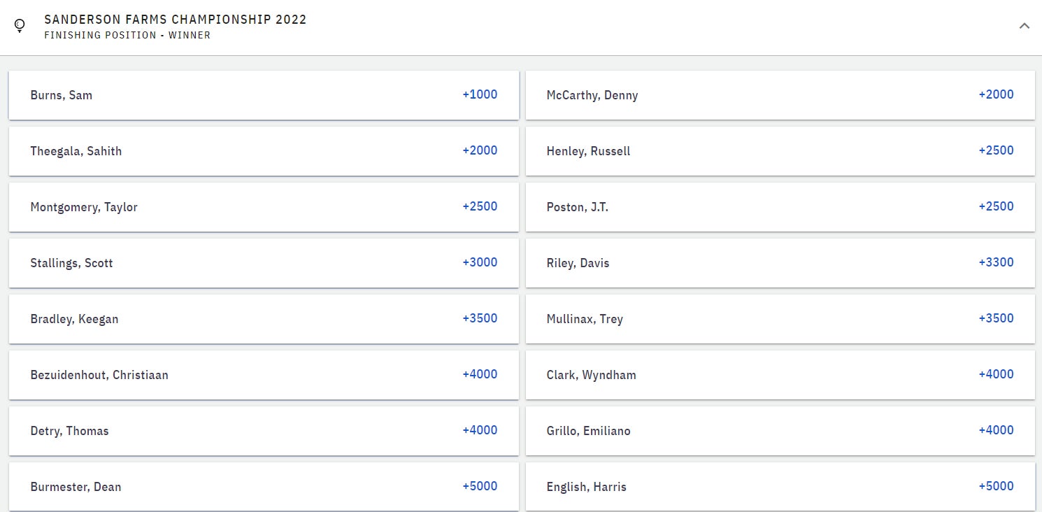 Predictably defending champion and highest ranked player in this field Sam Burns is the clear favorite at +1000 at the Barstool Sportsbook. He's the only American from the Presidents Cup team to be playing this week (Bezuidenhout is here for the Internationals and Sebastian Munoz withdrew on Monday) and he'd probably be resting this week if this wasn't a title defense. It's a course he's got good memz at and a weak field, so why not try to run it back? Plenty of time to rest in the coming weeks and months.