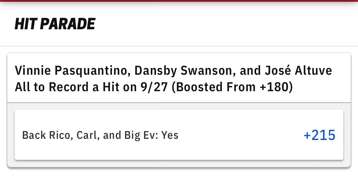 As we always do, the Hit Parade is available on The Barstool Sportsbook . Today features Dansby Swanson, Jose Altuve, and Vinnie Pasquantino at a boosted +215.