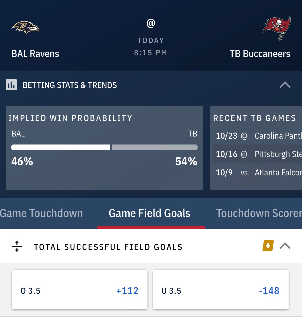 Tonight's game features a struggling Bucs offense, and the best kicker on the planet in Justin Tucker. If the Ravens get anywhere even close to field goal range you can expect a kick attempt instead of a punt. That helps this bet.