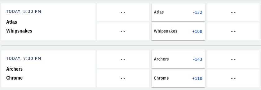 Obviously there's a lot of unknown since this is the first tournament and we've never seen any of these teams play sixes before. But I like Atlas -132 and Chrome +110 for tonight's games.