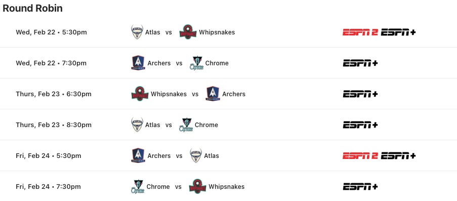 So for the inaugural Championship Series this year, we have the Archers, Atlas, Chrome and Whipsnakes in the tournament. Even though the Waterdogs won the championship last year over the Chaos, those teams finished as the 5th and 7th seeds at the end of the regular season.
