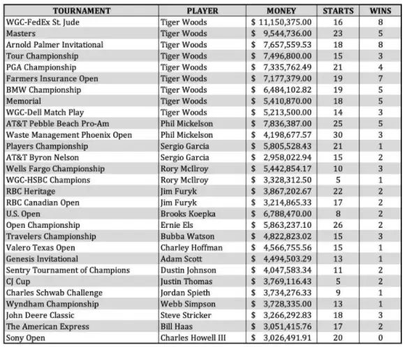 It would also be criminal if I didn't acknowledge Charley Hoffman and his typical dominance at this event. Golf Digest published this chart last January that showed the leading career prize money at each stop on Tour…. who on this list doesn't exactly fit?