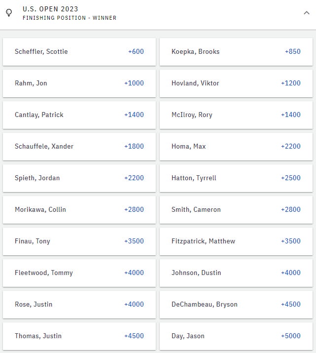 If you're going to put a gun to my head and go a different direction, I'm also on Xander Schauffele +1800. He's just so steady and has the all-around game that should lead to US Open success. There's no one part of his game that you point to and say "buuuuuut if that rears its ugly head" with him. DataGolf has him as the 4th most likely to win this tournament, which is out of whack with him being 7th on the board. Him and Cantlay are the two guys where I think a major win is imminent and X is the better value, but you can't go wrong with either.