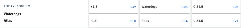 The Atlas are 1-1 so far to start the year after beating the Whipsnakes last week Both of their games came down to 1-goal. So don't be an idiot. Waterdogs +1.5.
