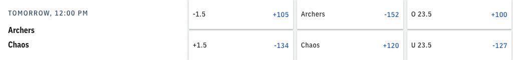 Obviously Chaos are always going to be a great team. They have championship pedigree, and arguably the best goalie on the planet in Blaze Riorden. So you should never expect the Chaos to get blown out. But you also shouldn't expect them to put up ridiculous numbers offensively against the Archers. Under 23.5 is the move here, with Archers -1.5 being a move you'll have to sweat out until the final possession.