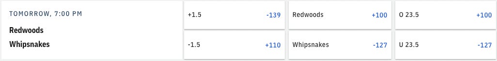 But I love this Redwoods team and the way they're playing right now. Ryder Garnsey has been borderline unstoppable so far this year, we saw some vintage Rob Pannell last week, and they're great at making the defensive adjustments when they need to. So give me Redwoods ML.