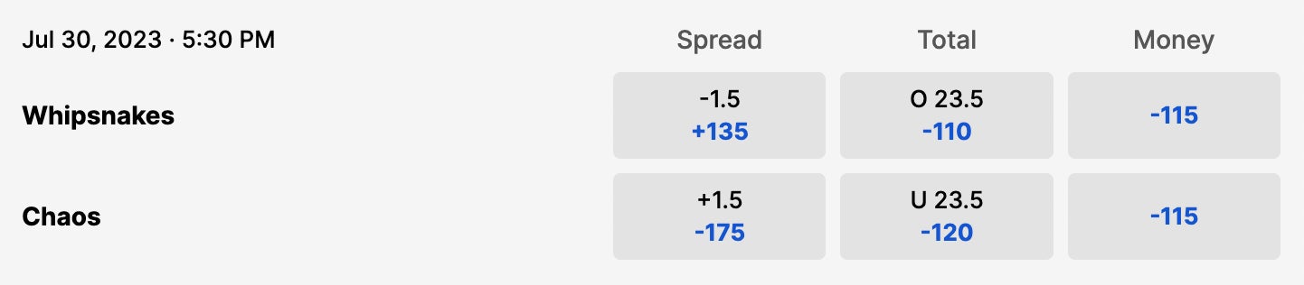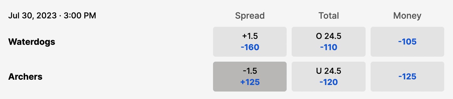 Potential championship preview game? It definitely wouldn't surprise me. Both these teams are absolute wagons. Both these teams have elite offense, great contributions from the midfielders, great defense, and all-world goalies. The only issue is that the Waterdogs starting goalie, Dillon Ward, will be out this week on paternity leave. Congrats on the sex. With that being the case, you have to give the edge to the Archers. So give me Archers -1.5 and considering this game is going to be on ABC, I'll take the over. We need a shit ton of goals on a nationally televised broadcast.