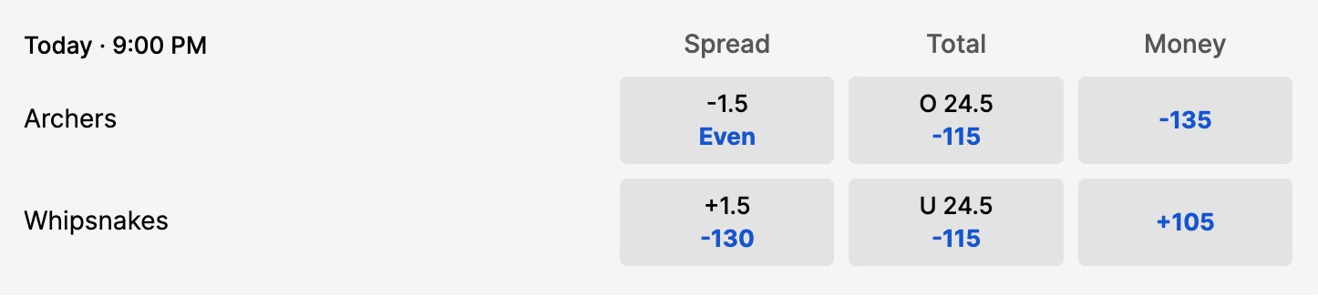 Archers being able to lock up the 1-seed with a week left to go in the season would be huge. You don't want to stray too far into the rest vs rust debate, but winning tonight means they could start to rest guys next week. Get everybody the week off for the 1st round of the playoffs, and come back as healthy as possible for the semifinals. The Whipsnakes are already in the playoffs after a bumpy start to the season, so they aren't fighting for much this week. Give me Archers -1.5.