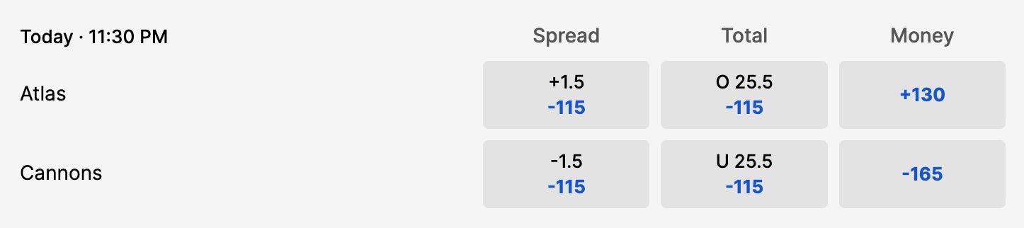Friday, 11:30pm // Atlas (2-6) vs Cannons (5-3) // ESPN+