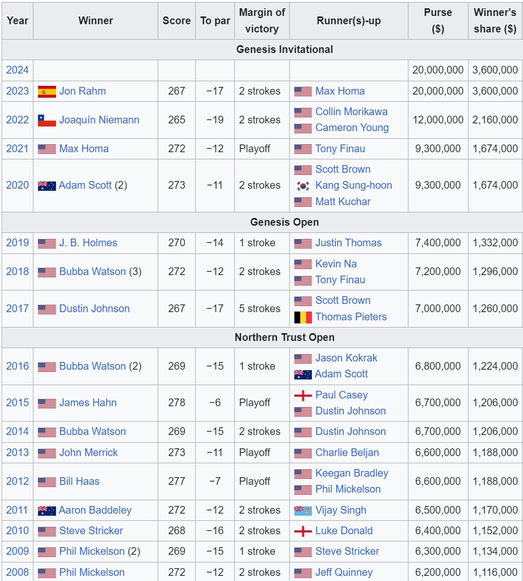 This is the 97th edition of this tournament, making it one of the longest running on the PGA Tour. Originally (and most traditionally) known as the Los Angeles Open, this tournament has gone through numerous name iterations. It's gone from a variety of names from the LA Open to the Nissan Open to the Northern Trust Open to the Genesis Open to finally starting in 2020… its current name as the Genesis Invitational.