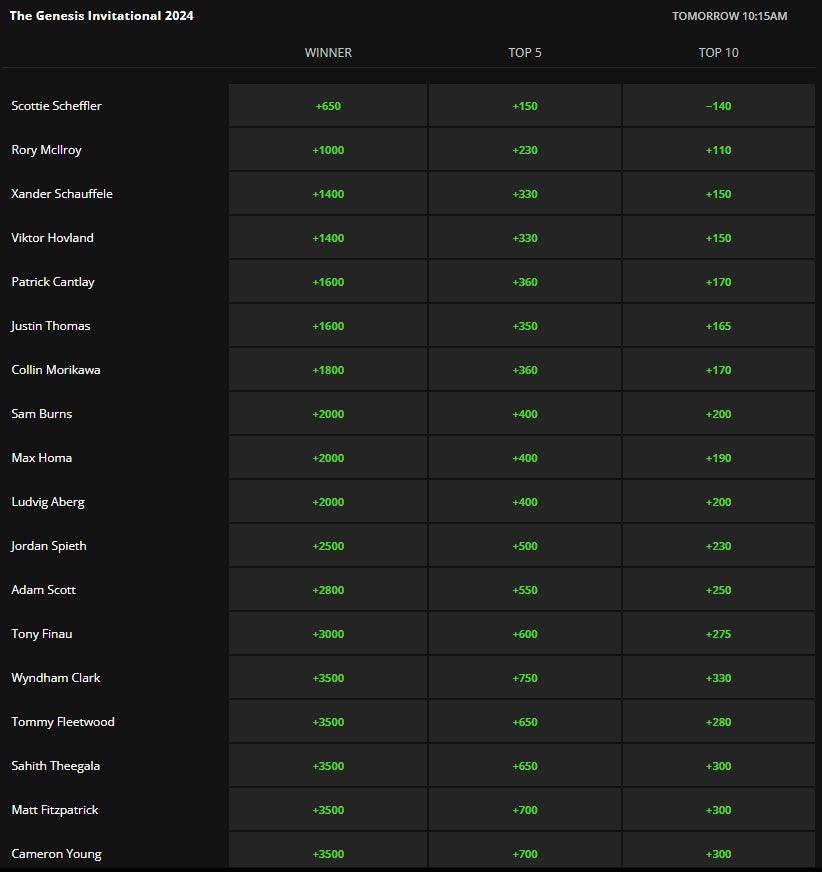 Scottie Scheffler is the clear cut favorite here, like he will be in any PGA Tour event he plays in for the foreseeable future. He's +650 to win at Draftkings, with Rory back at +1000. Scottie continues to stripe the everliving hell out of the ball, and the putter is actually starting to show a little more life his past couple of tournaments with him narrowly gaining strokes on the field putting in T-3 and T-6 finishes at Scottsdale and Pebble. He hasn't really contended at this tournament, but I will concede that his Top 10 line at -140 is tantalizing. I know some of this golf is in the distant past, but he's Top 10'd in 13 of his last 16 tournaments, and most of those tournaments also included another machine named Jon Rahm who was sure to take one of those top 10 seats. I'm in on Scottie Top 10 -140.