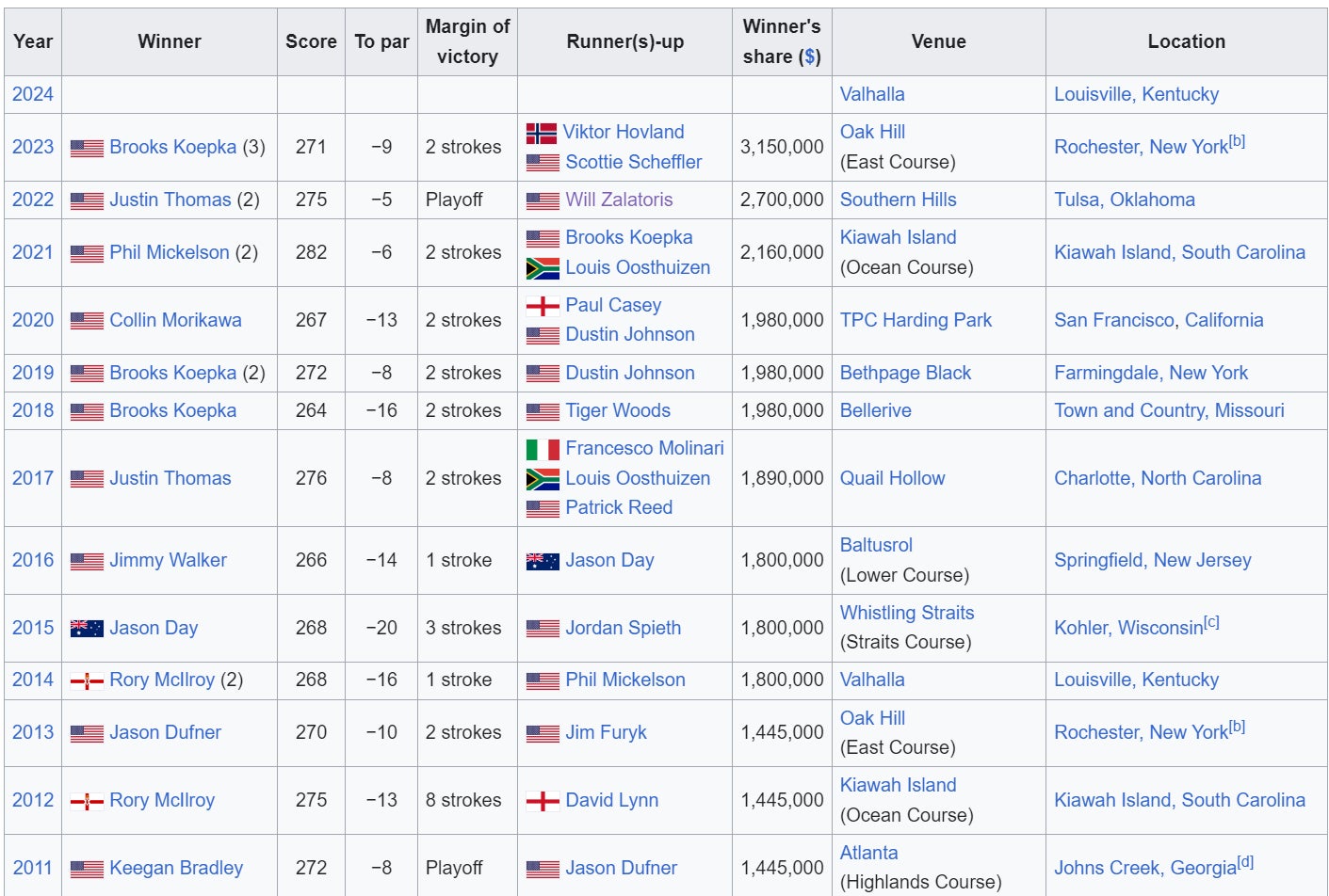 Last year's and 2014's leaderboards, along with recent winners of the PGA and at Valhalla.