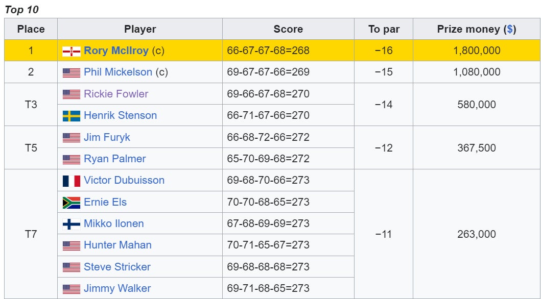 Last time it was contested here in 2014, Rory held a one shot lead going into Sunday before faltering with an over par front 9 and trailing by as many as 3. Rickie, Phil, and Henrik Stenson each charged ahead, but Rory was able to eagle #10 to close the gap to 1. He and Phil each stood at -15 on the 16th tee, but Phil bogeyed and Rory made birdie on the 17th to stretch his lead to 2 shots. Infamously as the sun was setting, Phil managed birdie on the par 5 18th after narrowly missing a bunker shot for eagle, but Rory was able to make a par of his own to close out a 1 shot win. It was Rory's 3rd straight start resulting in a win after having just won The Open and WGC-Bridgestone, and his 4th major championship win… which needs no more commentary.