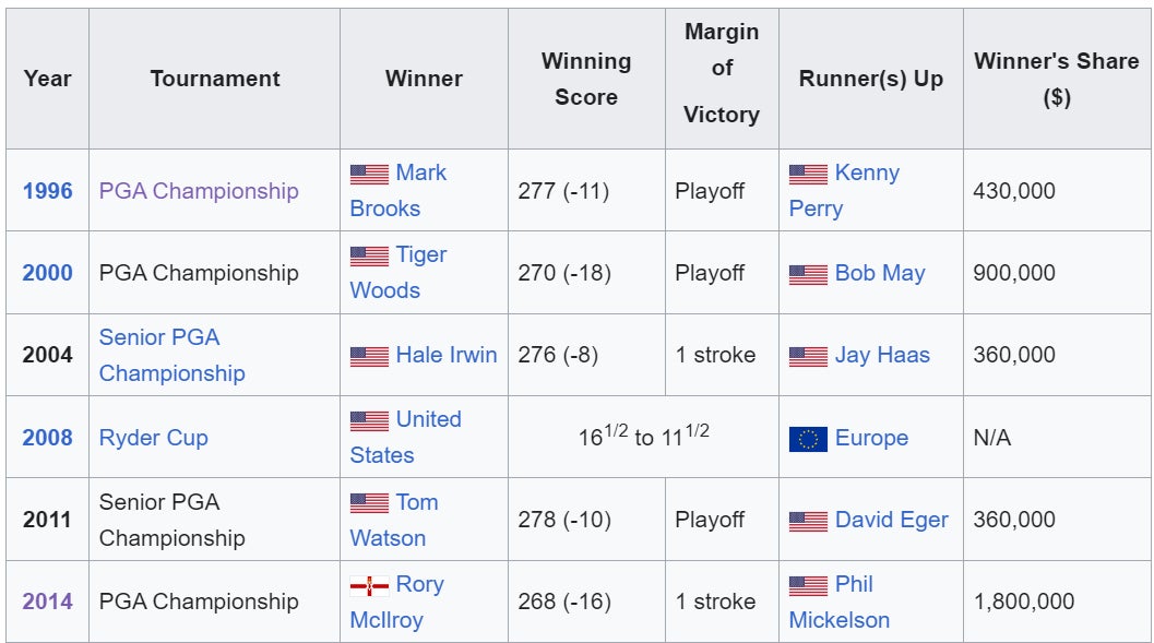 Valhalla was founded as a Jack Nicklaus design in 1986 of all years. This is the 4th PGA Championship held here, having also hosted in 1996, 2000, and 2014. It also hosted the 2008 Ryder Cup, where the Americans rolled the Europeans 16.5 to 11.5.